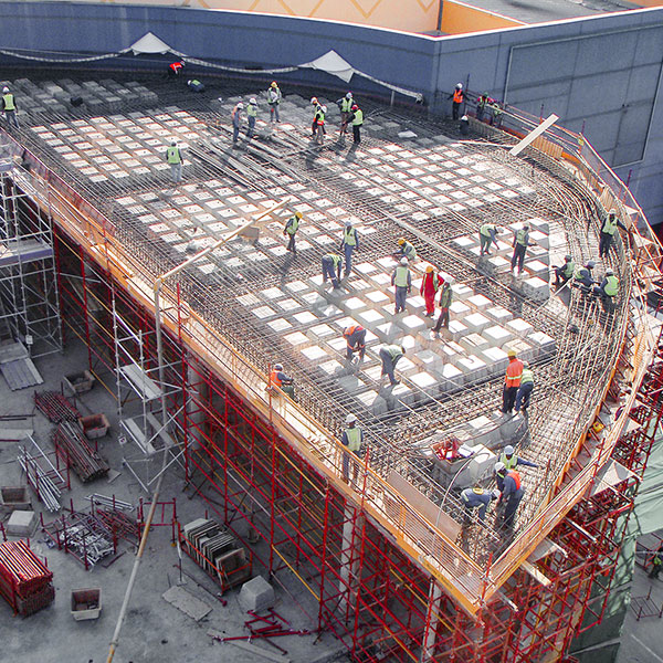 The ribs between the Coffers are reinforced and act as down stand concrete beams to produce a two way spanning concrete slab. Form-Scaff’s Trough system is used to produce a one way spanning concrete slab with a multiple inverted gutter shaped soffit finish. The ribs between the Troughs are reinforced to act as down stand concrete beams.